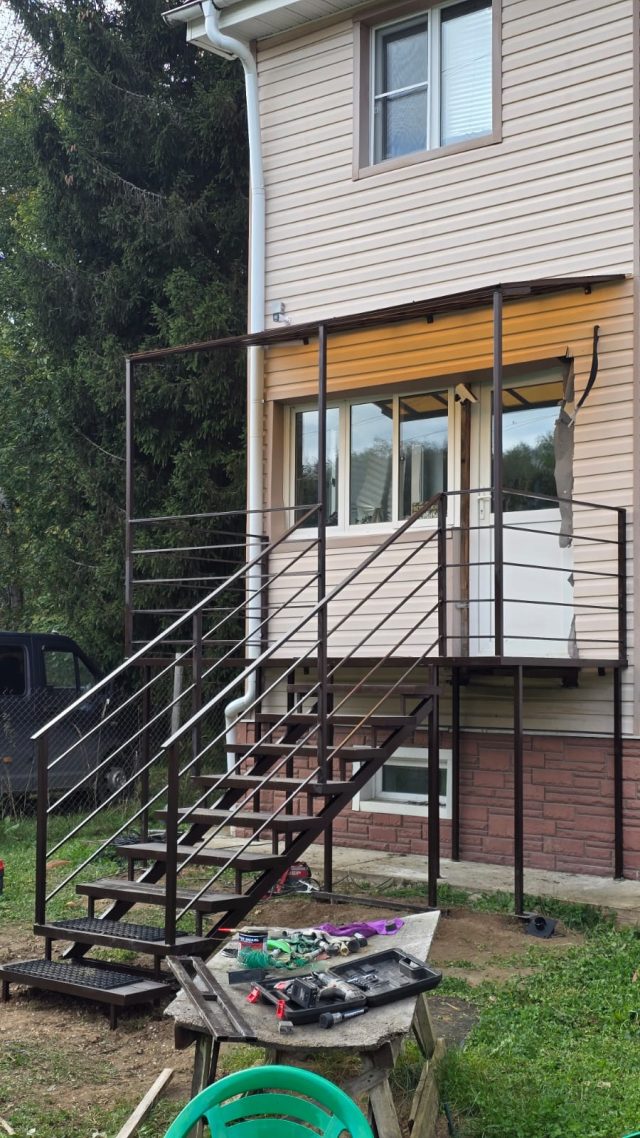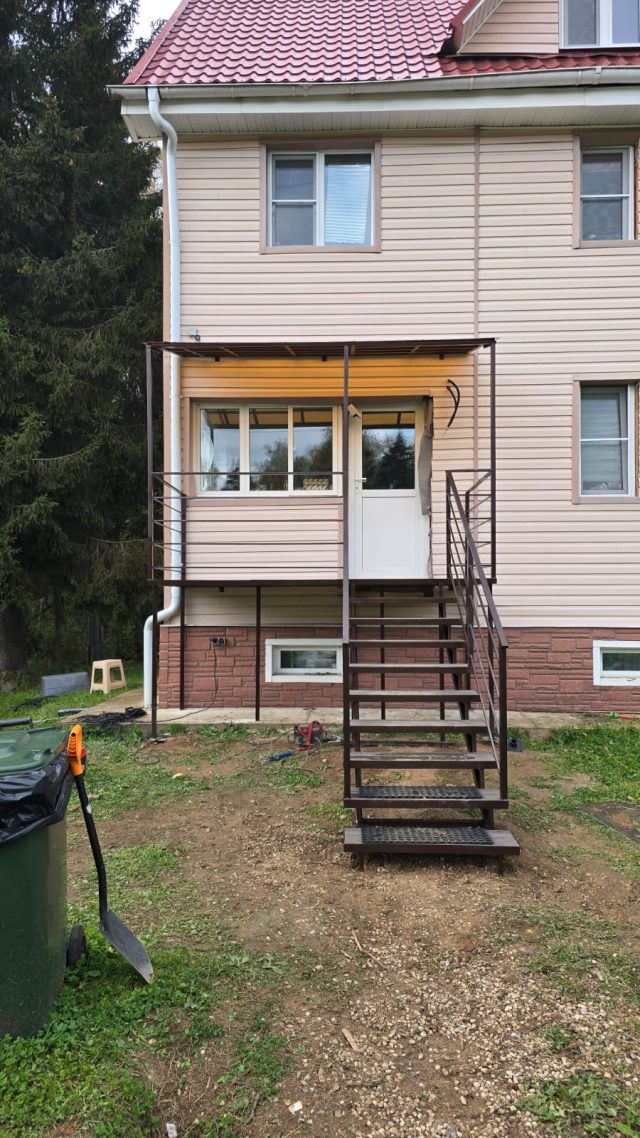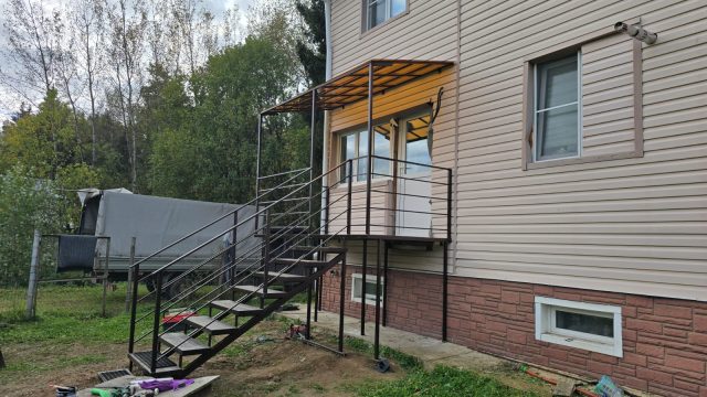 Лестница уличая с площадкой и навесом. Площадка 3200 х1500 мм для удобства выхода из дома. Каркас выполнен из профильной трубы 60х40 мм. Ступени и площадка из террасной доски ДПК 140х22 мм. По двум сторонам лестницы и по периметру площадки выполнено ограждение горизонтальные ригеля. Поручень изготовлен из профильной трубы 40х20 мм. Навес над площадкой из поликарбоната 4 мм.