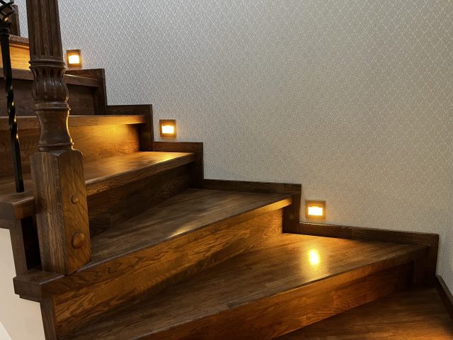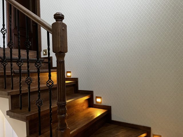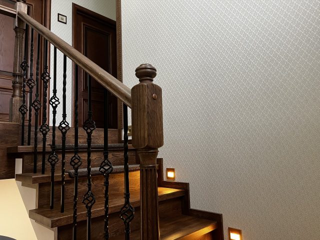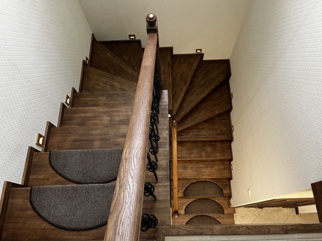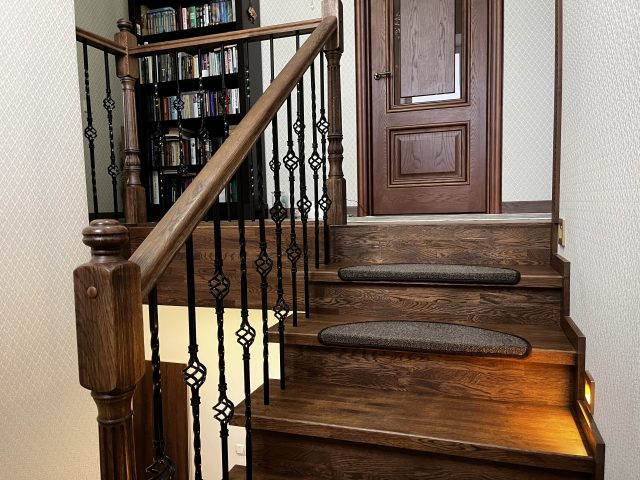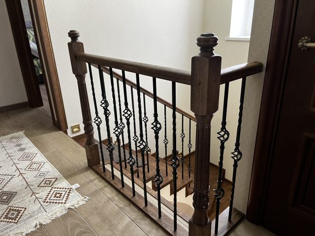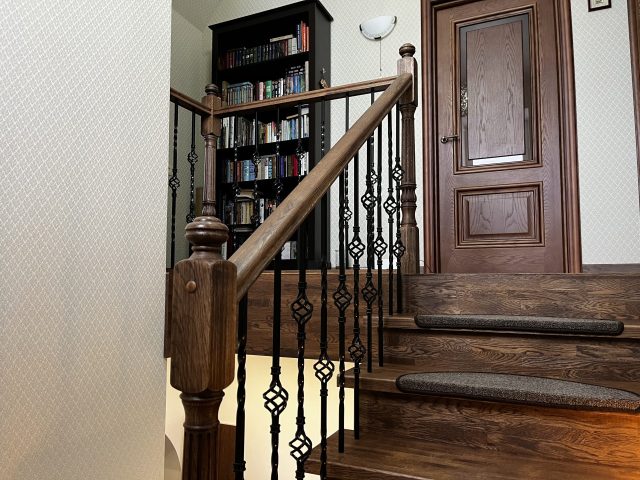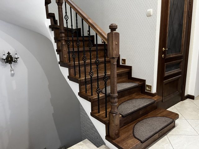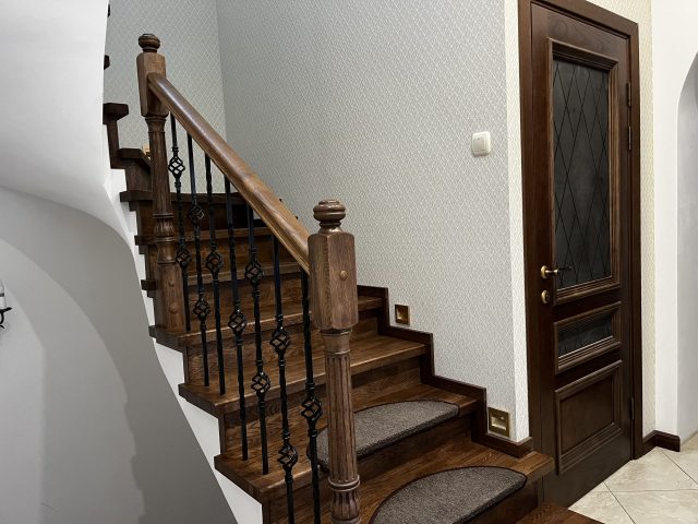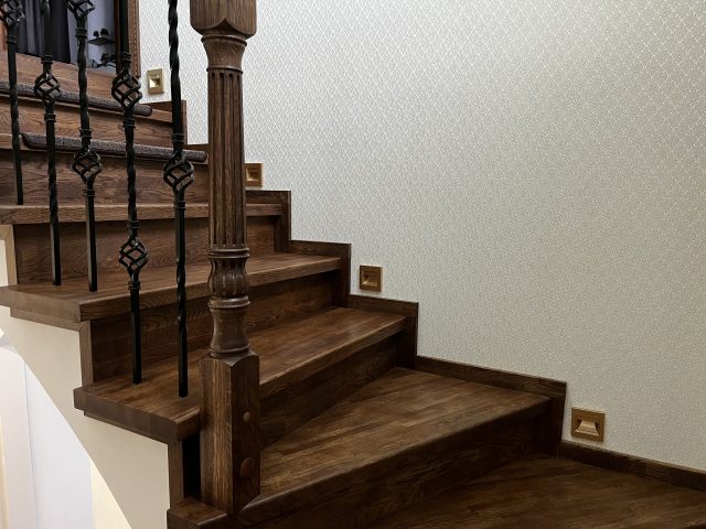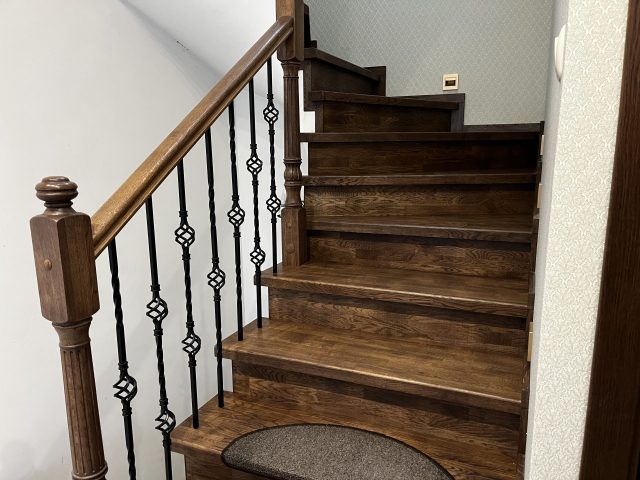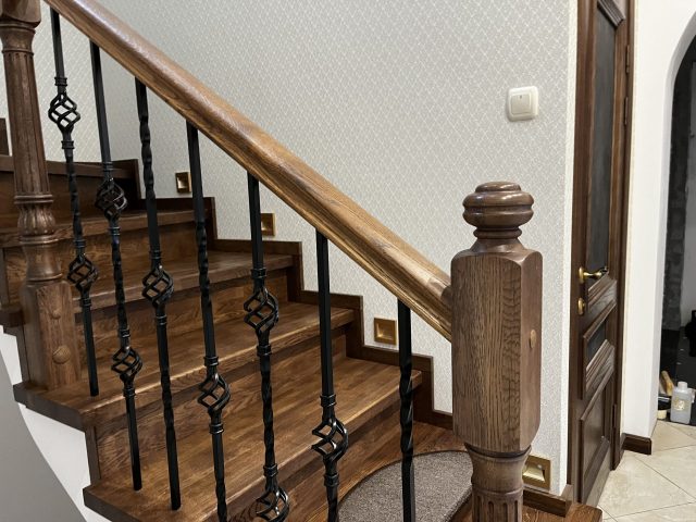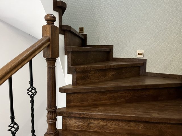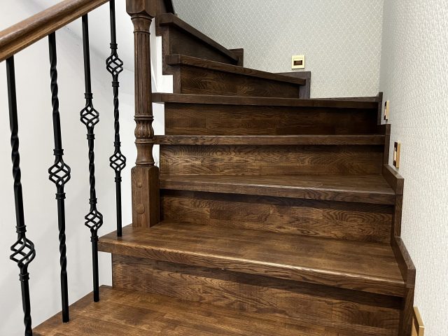 Отделка лестницы на бетонном основании массивом дуба. Лестница под отделку оснащена рядом поворотных ступеней с общим разворотом на 180 градусов и примыканием к проему второго этажа. После отделки лестницы, на неё были установлены кованык ограждения. Вся конструкция была тонирована в приятный коньячный цвет.
