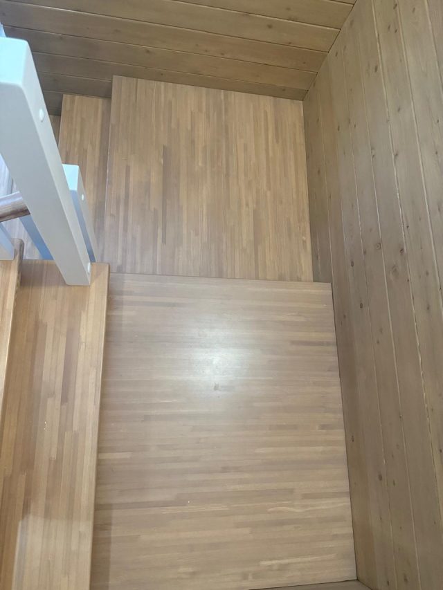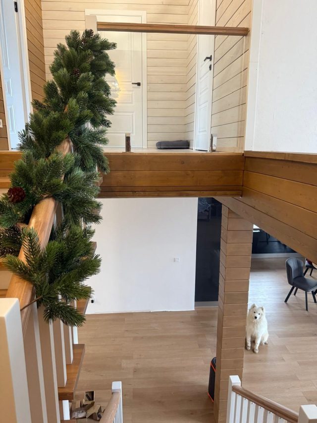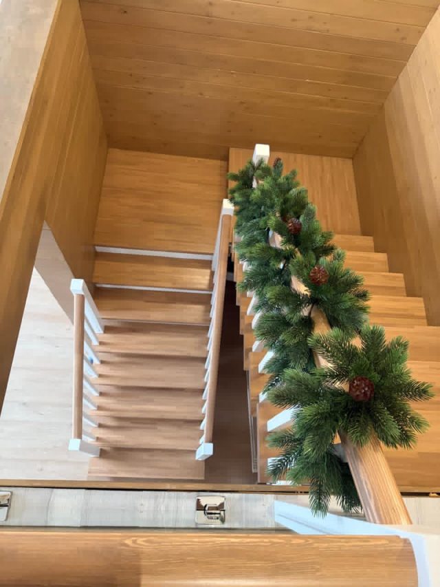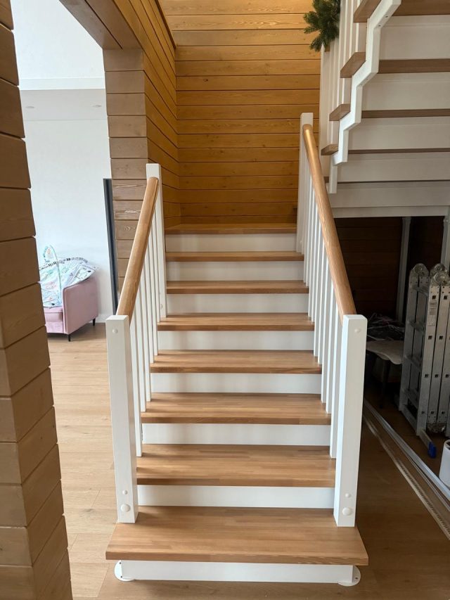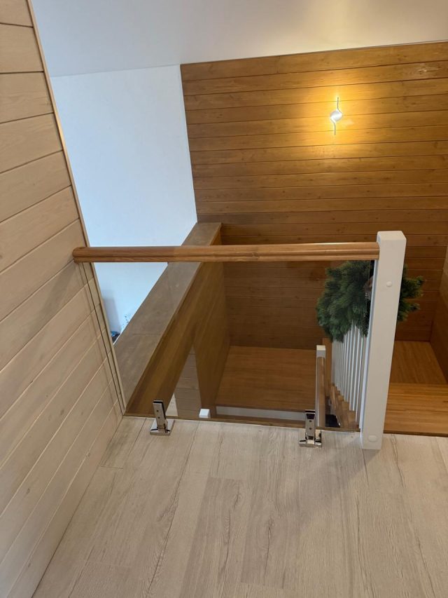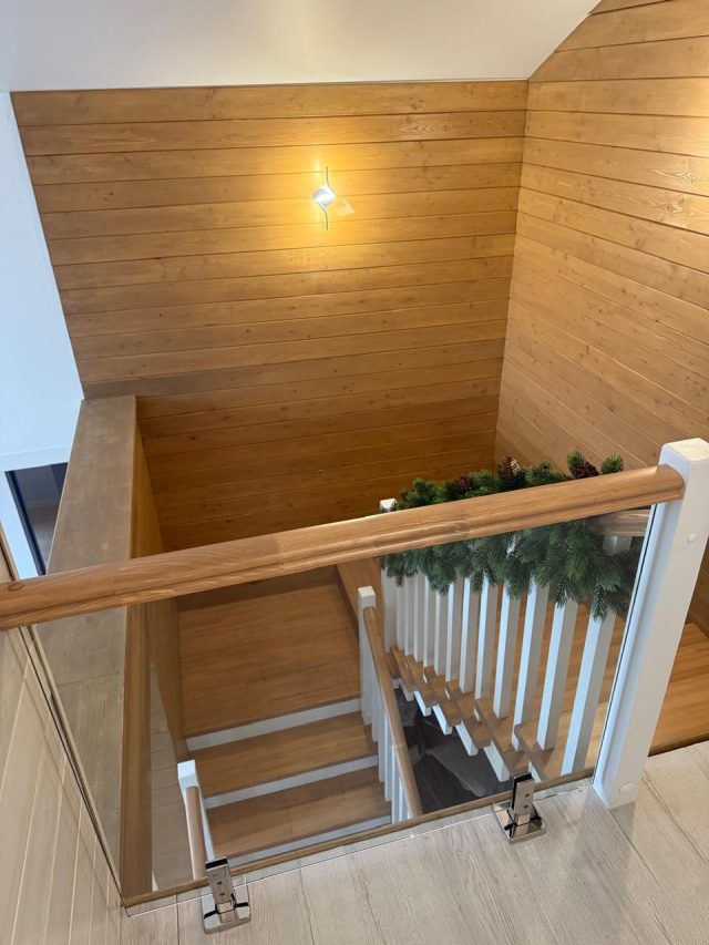 Лестница с поворотом на 180 градусов на двойном каркасе из профильной трубы 80х40 мм. Ширина марша 1200 мм, поворот выполнен из двух площадок 1000х1200мм. Материал ступеней может быть в разном исполнении: ясень, дуб, сосна, лиственница. Ограждение вдоль лестницы выполнено из лиственницы, которые придают лестнице единство цвета и дизайна. Ограждение второго этажа стекло на мини стойках.