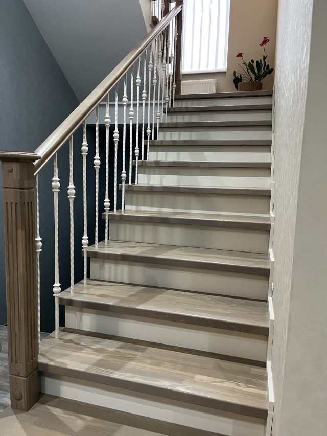 Отделка бетонной лестницы с кованым ограждением