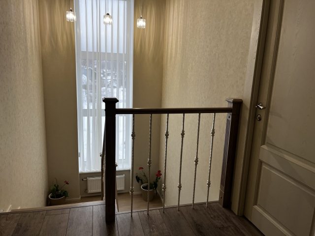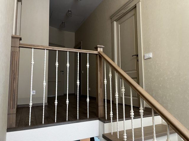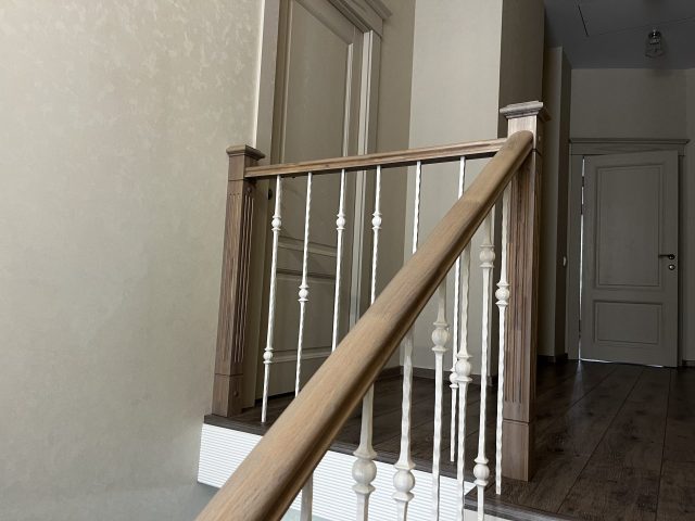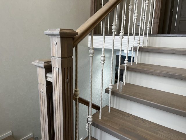Сверху на деревянные ступени установлено кованое ограждение и поручнем из ясеня.
