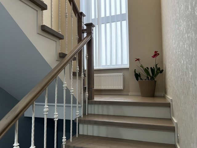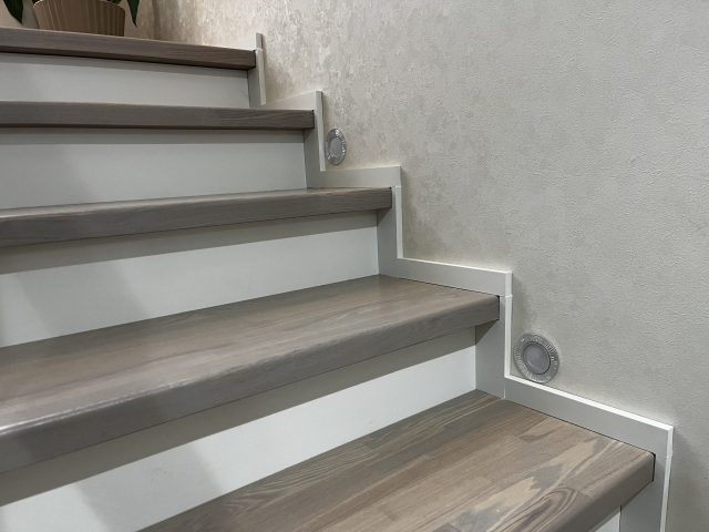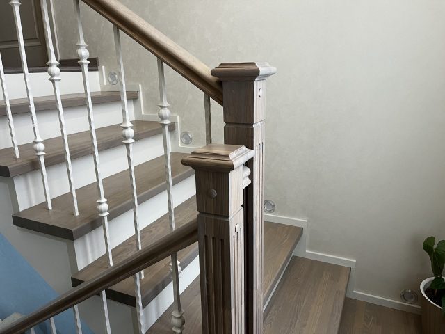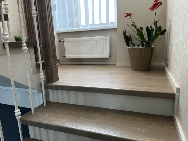 Облицовка бетонной лестницы с поворотом на 180 градусов. Выполнена полная отделка ступеней и подступенок. В качестве материала отделки был выбран массив ясеня. Ясень отлично поддается обработке, является крепкой и устойчивой к гниению породой.