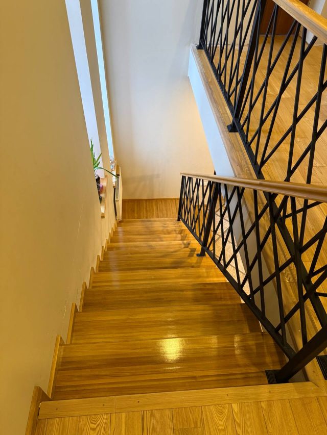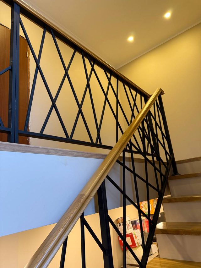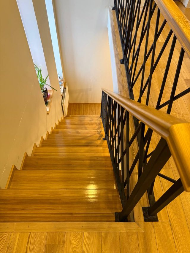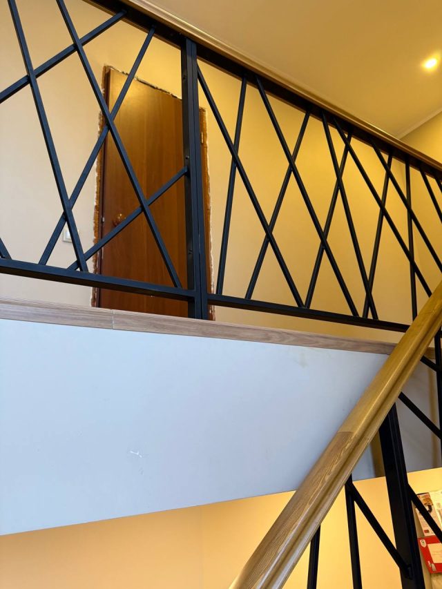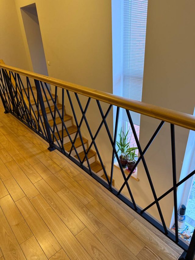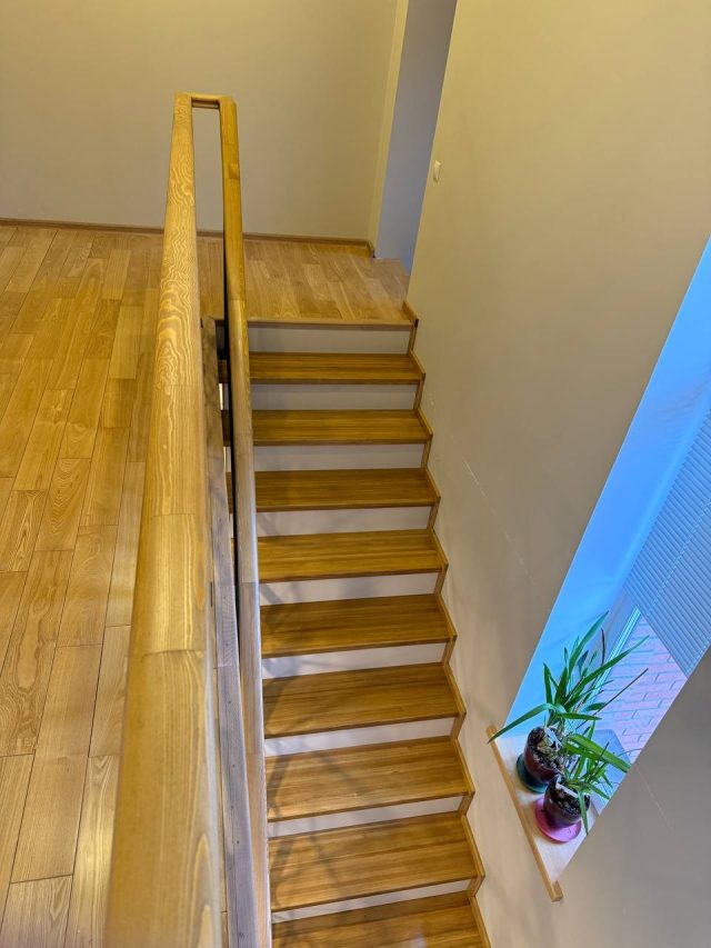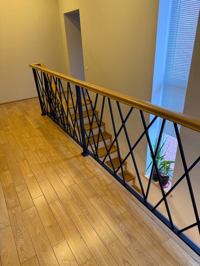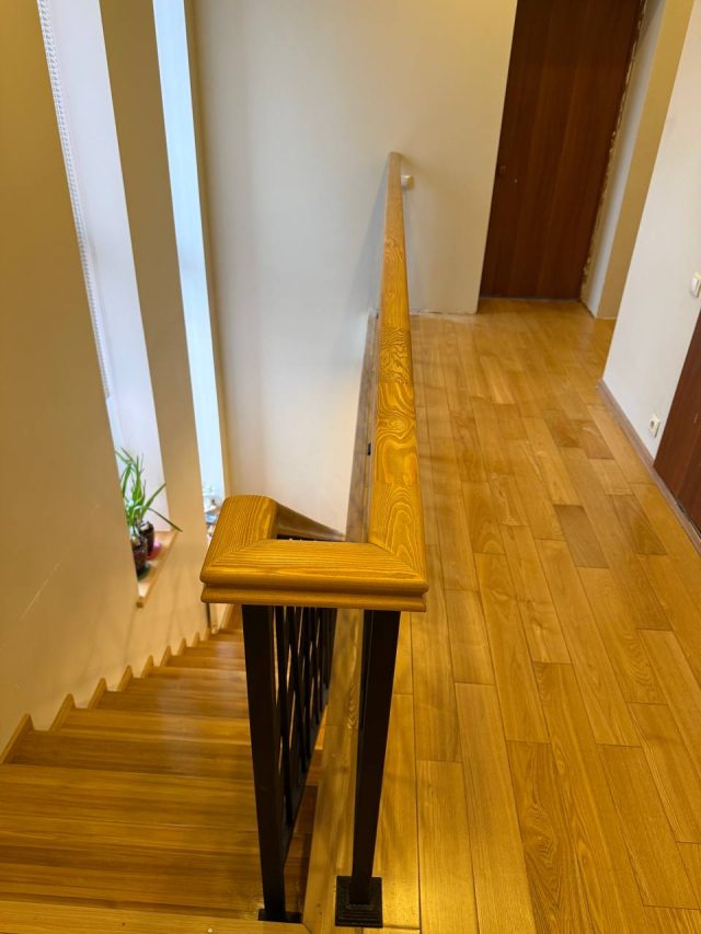 Отделка бетонной лестницы с поворотным участком в виде промежуточной площадки. После изготовления и монтажа, каркас был отделан при помощи деревянных элементов: ступени, подступенки, ограждение, а по стене над ступенями установлен плинтус. Лестница оборудована ограждением из прутка 15х15 мм с деревянным поручнем. По желанию заказчика покраска лестницы была выполнена в двух цветном исполнении.