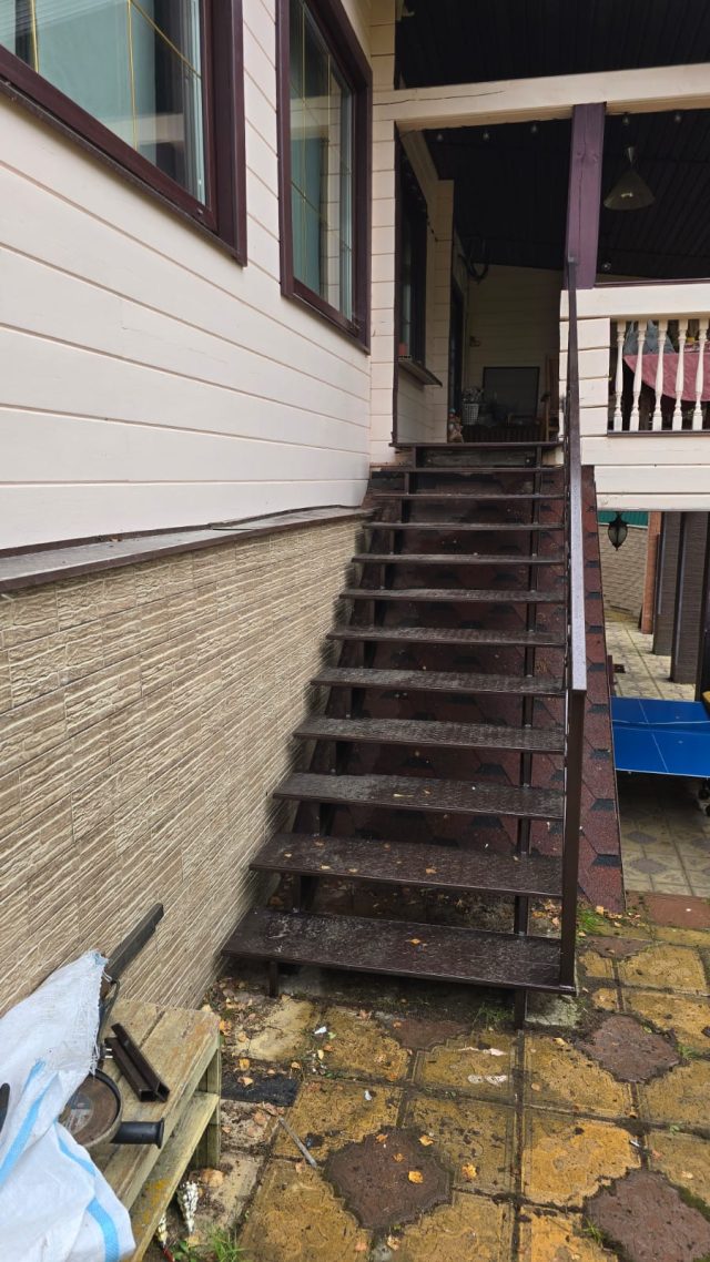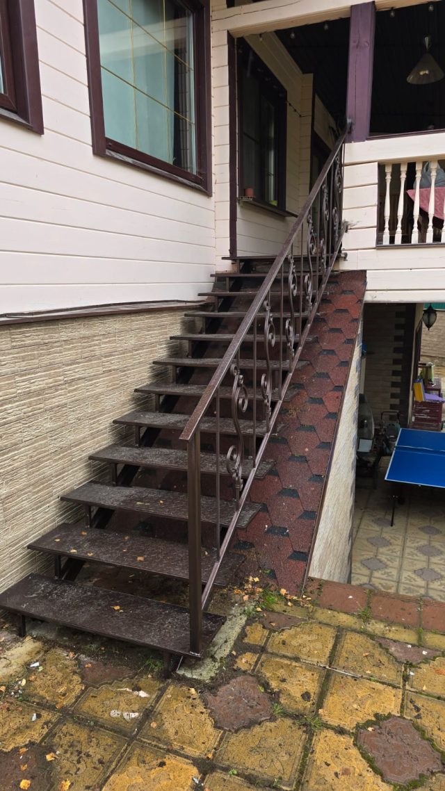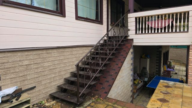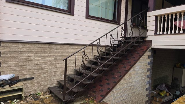 Уличная лестница с кованным ограждением «Ажурное. Важное преимущество кованых перил заключается в том, что они великолепно сочетаются с лестницами из любых материалов.В данном случае ступени выполнены из металлического рифлённого листа.Каркас выполнен из двух прочных ломанных профильных труб 60х40 мм. Лестница с шириной прохода 1100 мм и шагом подъема 157 мм.
