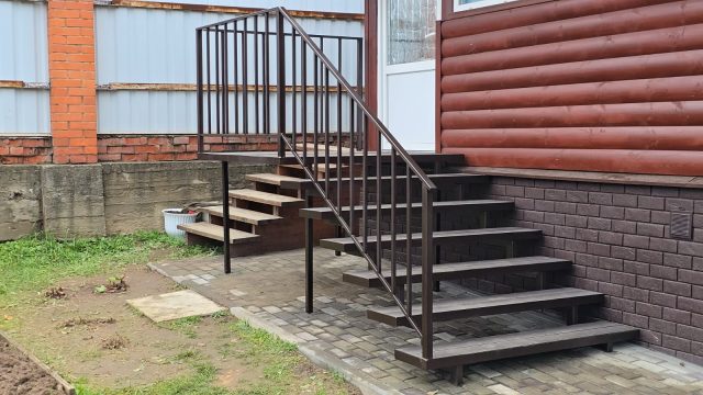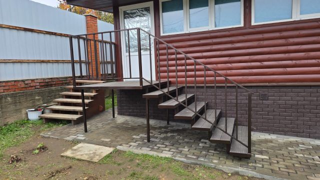 Уличная лестница со ступенями из ДПК. Каркас — металлический из трубы 60х40 мм. Ограждение вертикальные балясины. Ширина ступени 1500 мм,размер площадки 1500 мм х 1500 мм.
