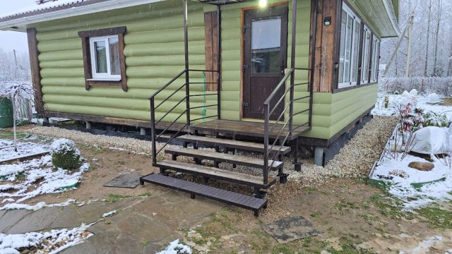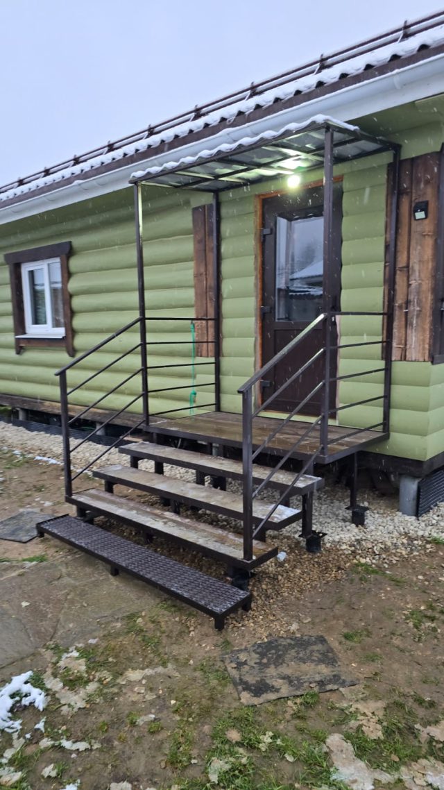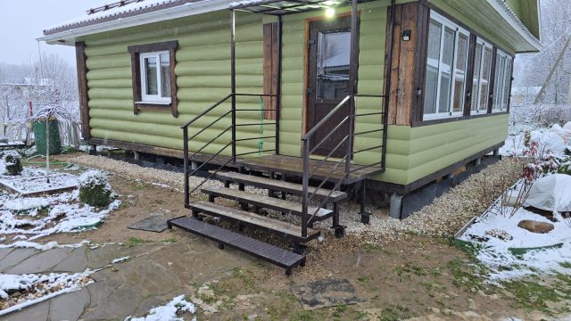 Лестница с площадкой и навесом. Площадка 1000х1800 мм для удобства выхода из дома. Каркас выполнен из профильной трубы 60х40 мм. Ступени и площадка выполнены из материала заказчика. По одной стороне выполнено ограждение. В данной модели имеется навес который расположен на опорных стойках над площадкой и имеет прямую форму под углом к дому. Материал покрытия козырька — сотовый поликарбонат 8мм.