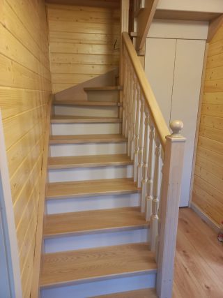 Деревянная лестница для частного дома. Вдоль лестницы и проема было...