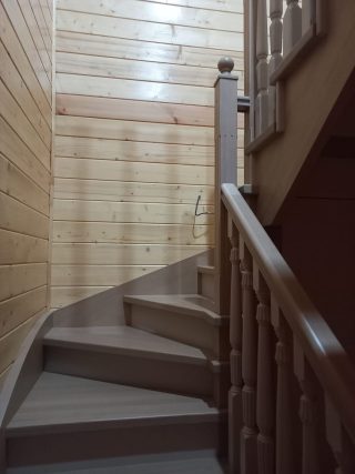 Отделка металлической лестницы массивом сосны. Поворотный участок выполнен с помощью...