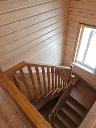 Деревянная лестница для частного дома с поворотным участком в виде...